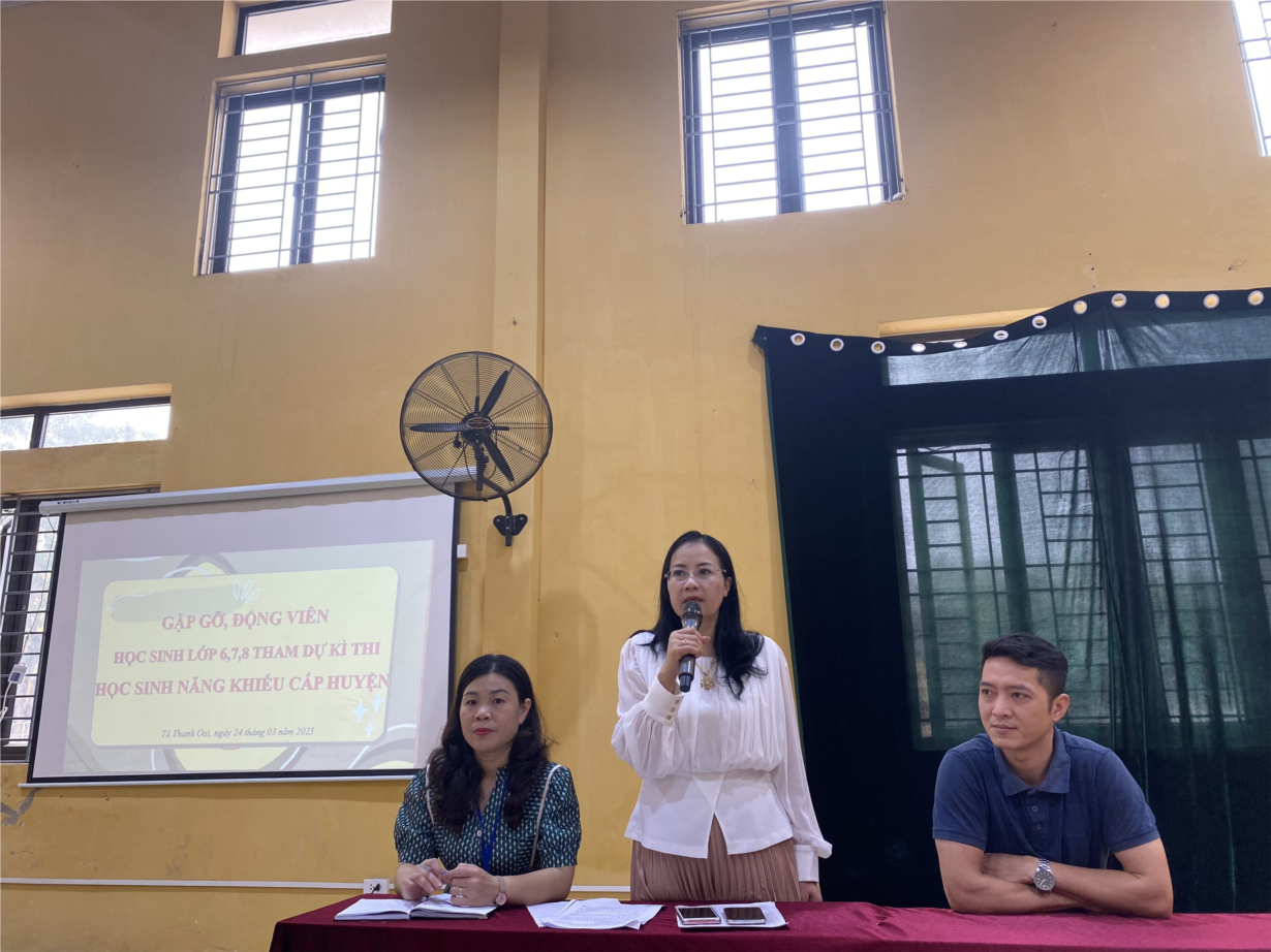 Mở đầu cho buổi gặp mặt đầy ý nghĩa, Cô giáo Đào Thị Phượng - Hiệu trưởng nhà trường đã có lời phát biểu động viên, dặn dò học sinh về thời gian, địa điểm, kinh nghiệm và kỹ năng làm bài. Những lời dặn dò thực sự cởi mở, chân tình của cô đã truyền cho các em HS ý chí quyết tâm và sự cố gắng hết mình cho cuộc thi sắp tới. Cô cũng bày tỏ lòng yêu mến và trân trọng những nỗ lực của các em trong quá trình học tập và cảm ơn các thầy cô giáo phụ trách CLB HSNK của nhà trường đã mang tâm huyết, hết lòng yêu nghề, tận tụy truyền dạy kiến thức cho học sinh thân yêu.