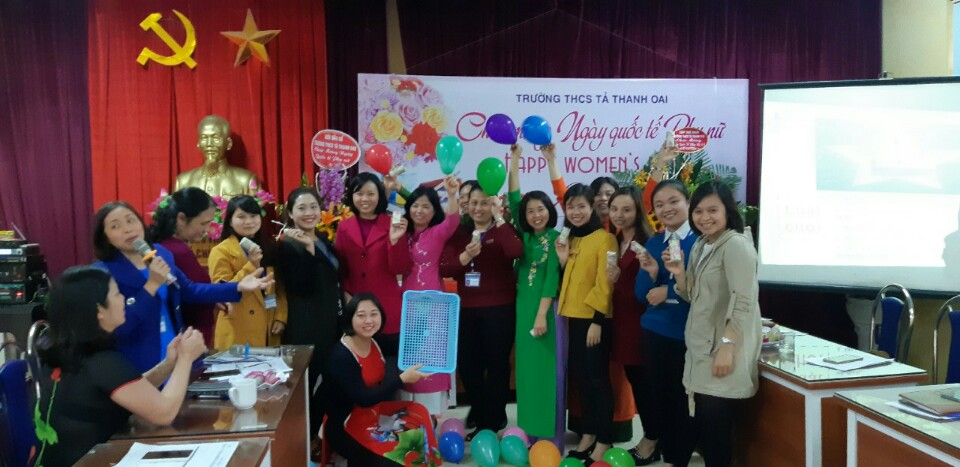 Hình ảnh rể của THCS Tả Thanh Oai tặng hoa cho tập thể CBGV - NV nữ.